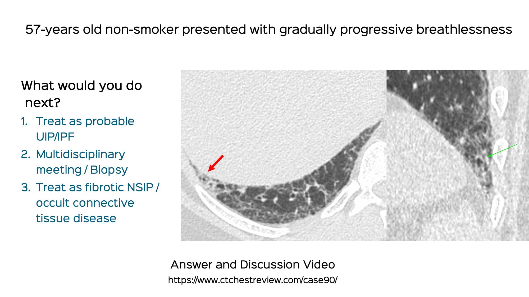 Technical and Practice Issues * Case 11: 62-years old misdiagnosed to have interstitial lung disease - mid-inspiratory and expiratory scans * Snippet 03: Radiation risk and CT chest * Case 23: 60-years old - 40-pack years smoker - right upper lobe nodule - resolved using “mean” reconstructions…
