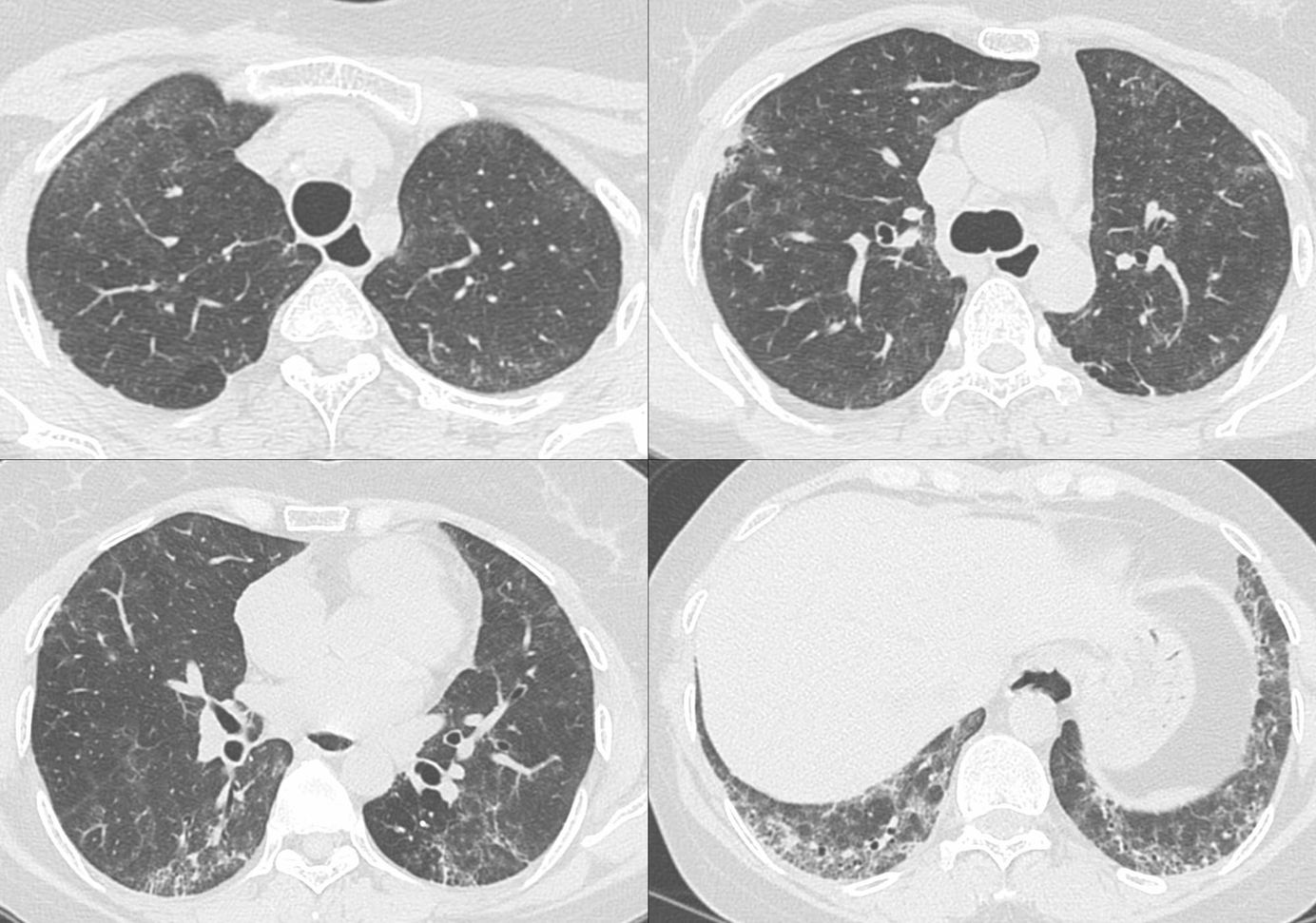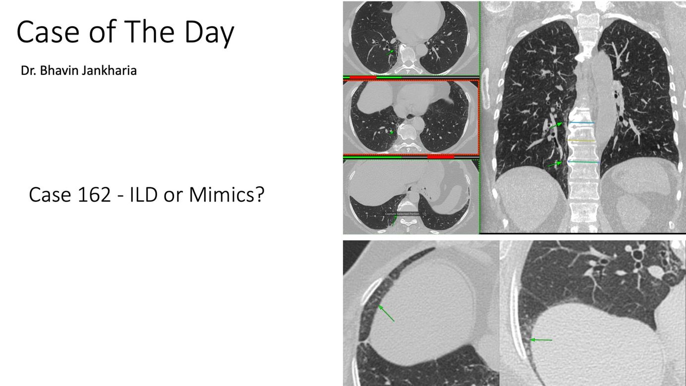 A repeat CT scan showed interstitial lesions. The question is are they "real" and imply interstitial lung abnormality disease (ILD) or they are mimics.