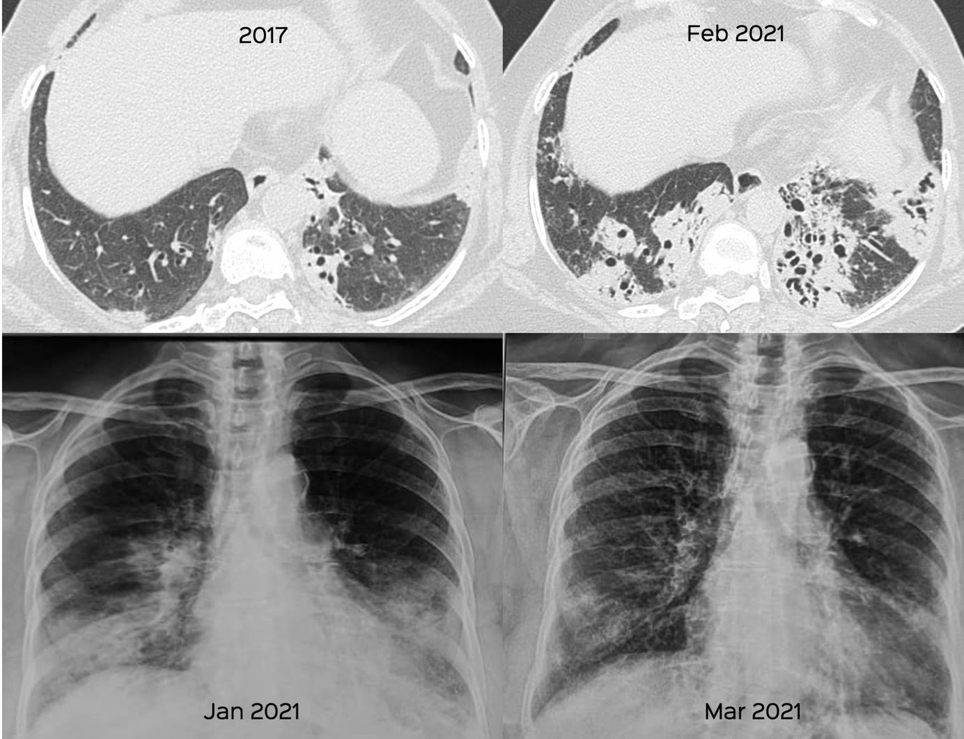 67-years old lady who presented in 2017 with an organizing pneumonia (OP) pattern, and then 3 years later with significant progression