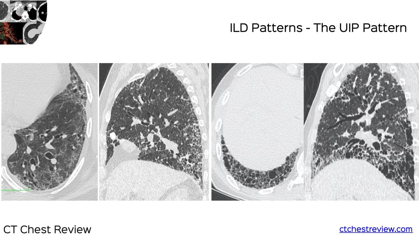 The UIP pattern, characterized by reticular opacities, subpleural basal predominance and traction bronchiectasis with or without honeycombing is the classic fibrosing ILD pattern. Primary UIP implies IPF, while secondary UIP implies other etiologies