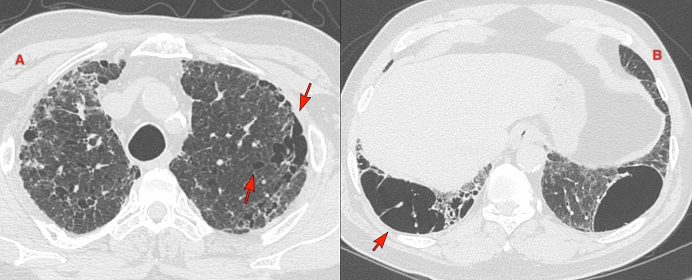 64-years old with rheumatoid arthritis on treatment had dyspnea. He was a 15-pack years smoker who had stopped 10 years ago. He was known to have ILD since 2023 and was on anti-fibrotics.