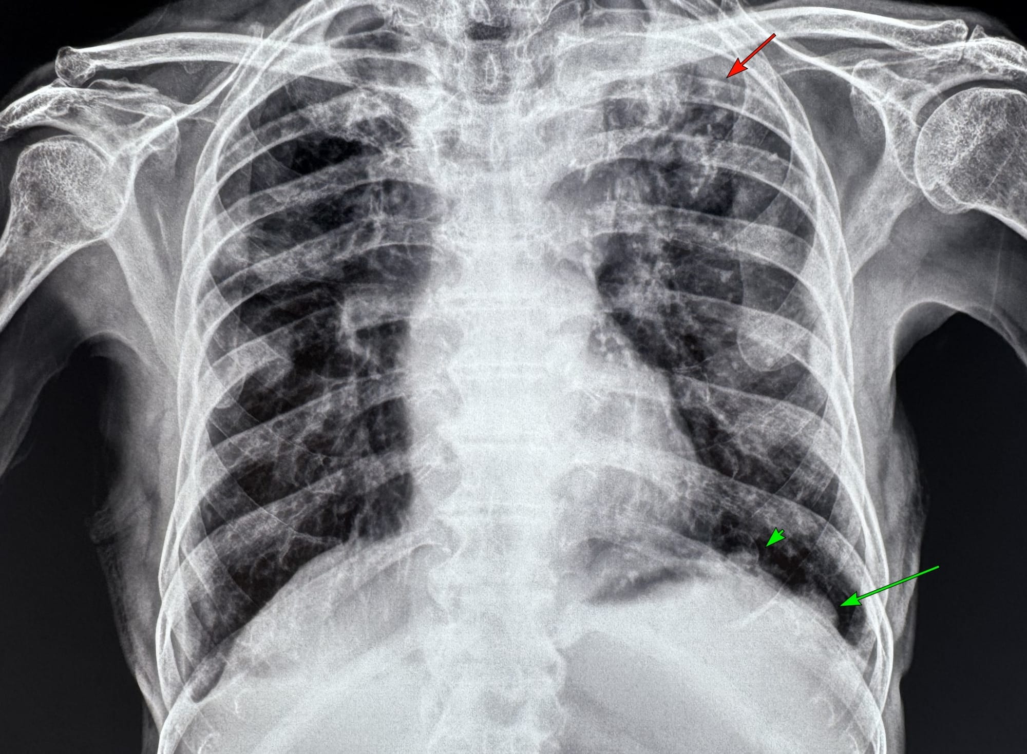 77-year-old man presented for an opinion with pleural plaques (green arrows) and upper lobe fibronodular lesions (red arrow) on a radiograph