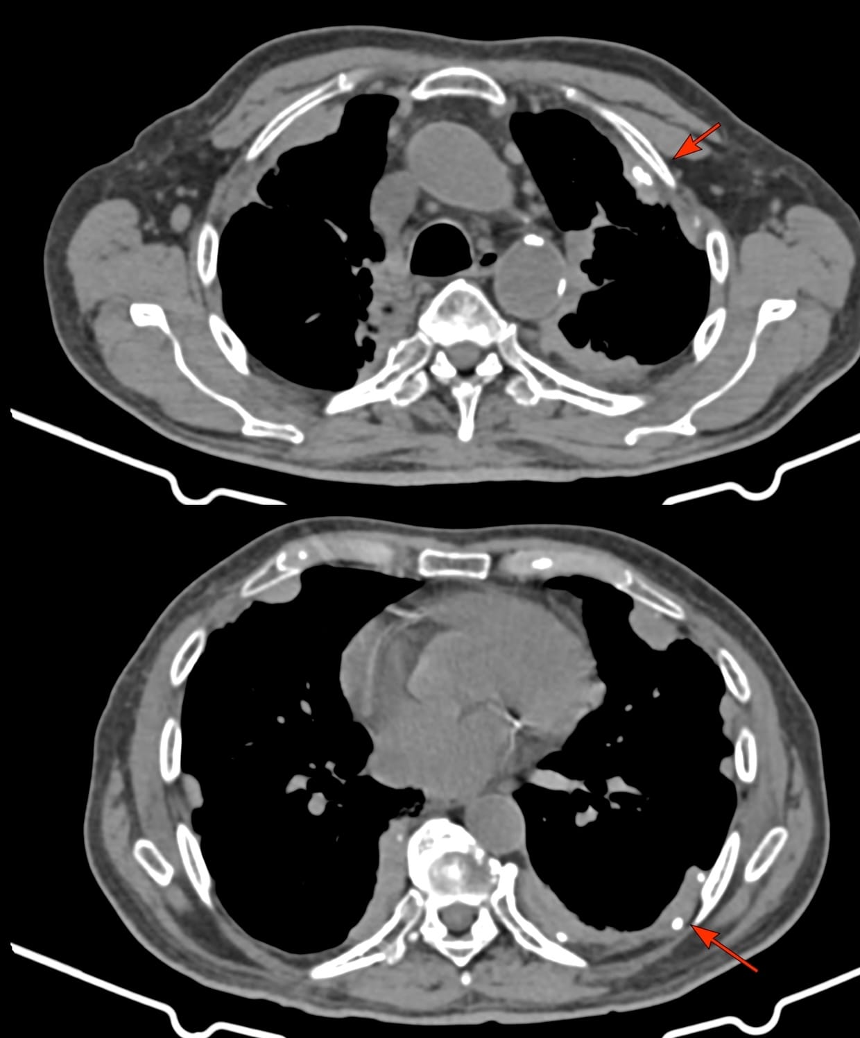 The CT scan showed extensive pleural plaques (arrows), some calcified, some not.