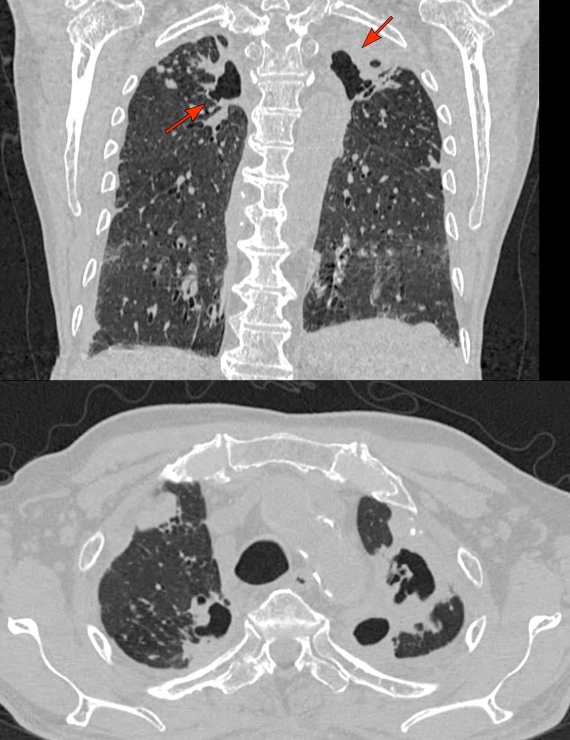 He also had coexistent resolving tuberculosis (on AKT) with fibrocystic and fibrocavitary lesions in the upper lobes (arrows).