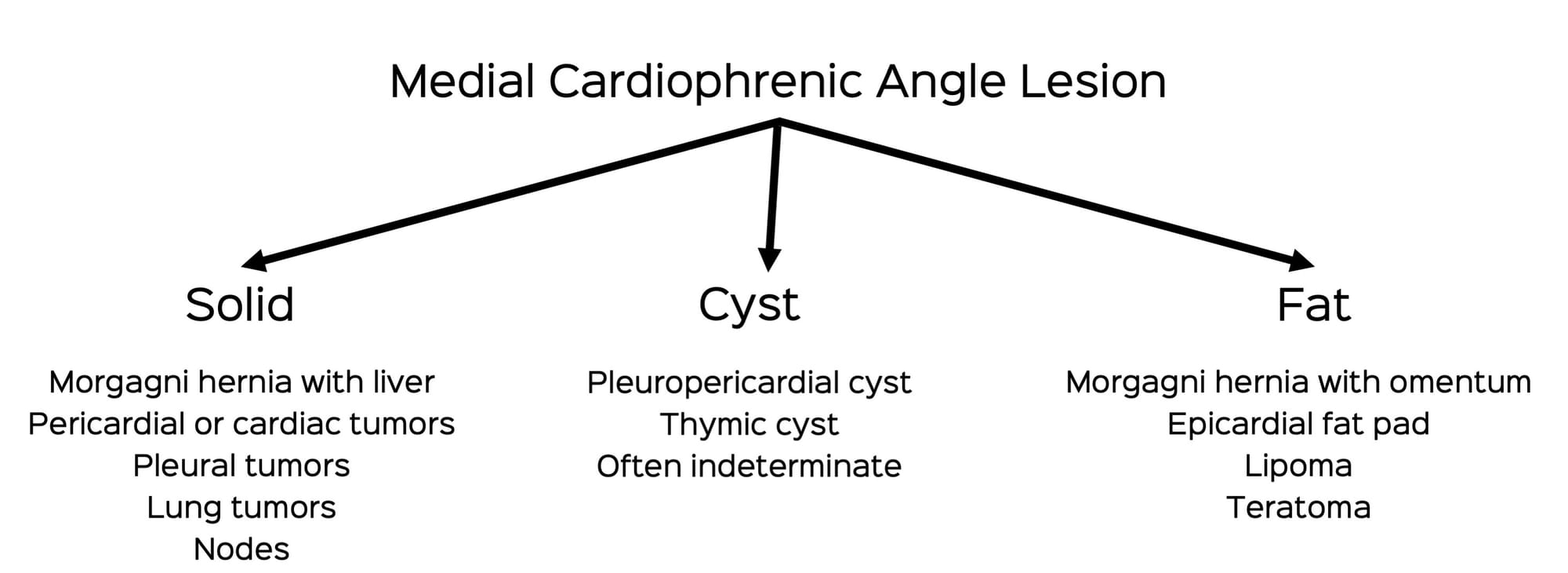RMCPA (right medial cardiophrenic angle) lesions can be sorted out the same way as all mediastinal lesions, by first differentiating them into fat-containing, cystic or solid and then figuring out the origin (lung, pleura, mediastinum, heart).